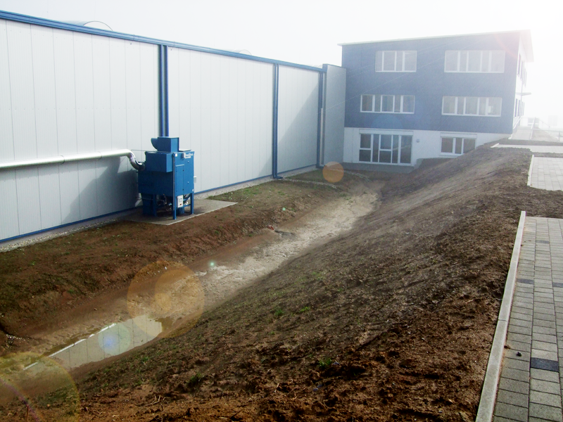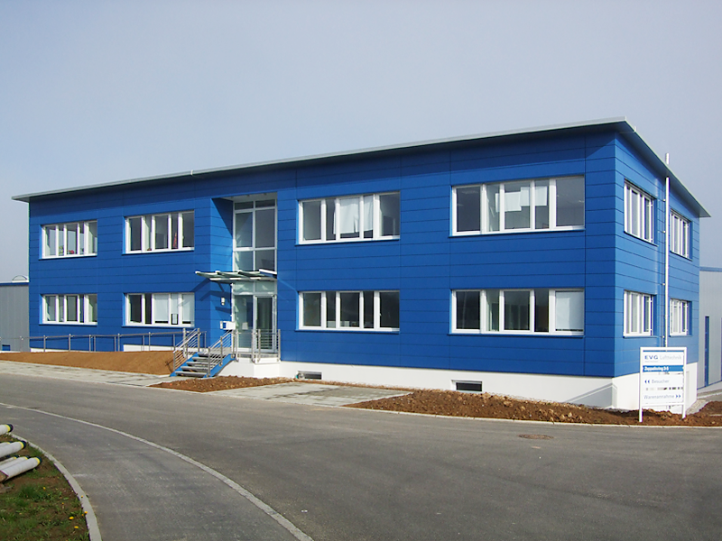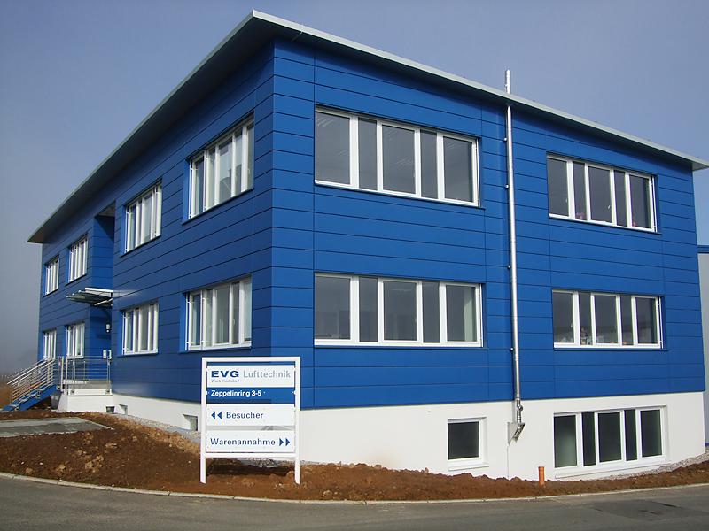 Die Firma EVG Lufttechnik benötigte eine größere Produktionsfläche. Somit wurde ein moderner Neubau erstellt, der aus einer 2-schiffigen Produktionshalle mit 2.585m2 Grundfläche einschl. eines Versuchsraum für Probeläufe der Ventilatoren besteht. Die Belichtung erfolgt über 8 Stück Dachlichtbänder in der Dachfläche mit zusätzlicher RWA-Anlage. In der Fassade sind senkrechte, hohe Fensterelemente eigebaut, die die Belichtung optimiert. Für das individuelle Arbeiten sorgen 2 Stück 10t und 2 Stück 5t Krananlagen.