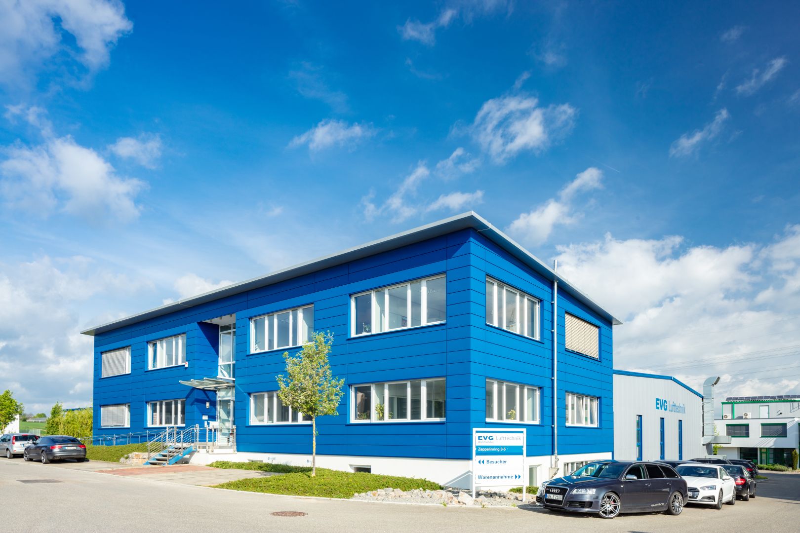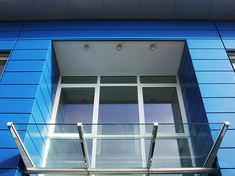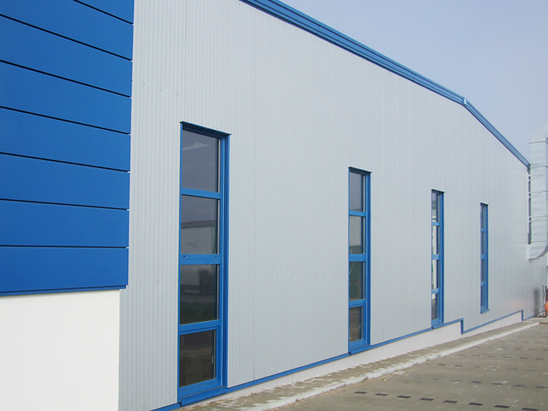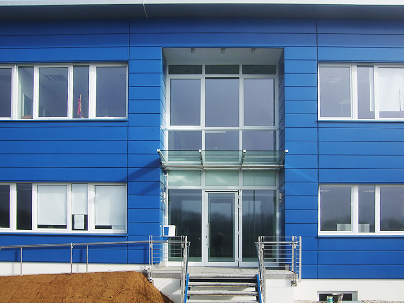 Das Besondere ist ein repräsentativer Eingang und Empfangsbereich. Die Fassadenverkleidung ist als Glattblech-Fassade ausgebildet.