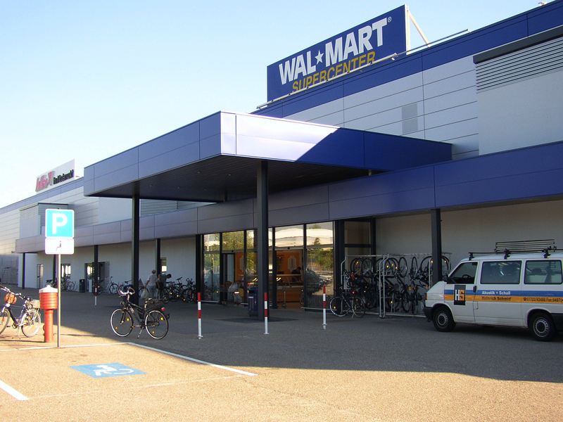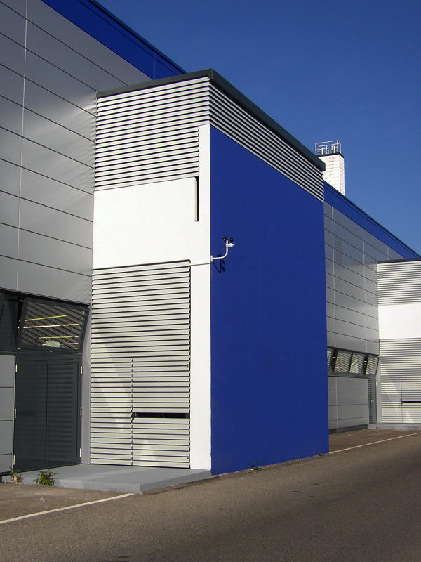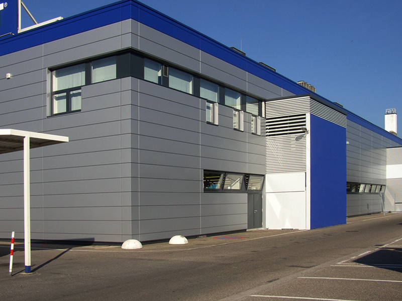 3.000 m² Fassadensanierung eines Einkaufscenters in Karlsruhe-Bulach, die Fassadenverkleidung ist als Stahltrapez-Planum ausgebildet. Anbau von diversen Vordächern.