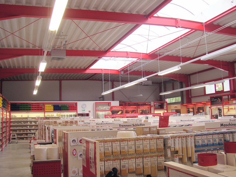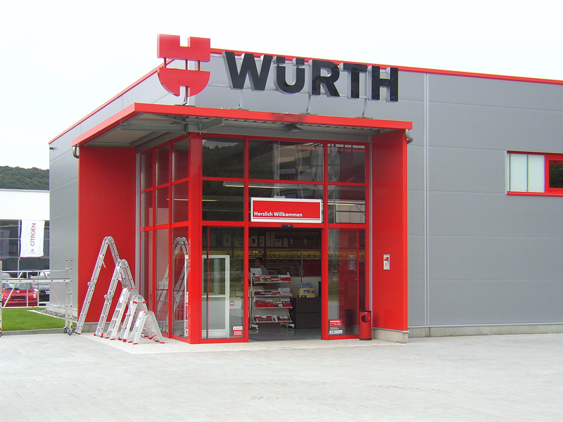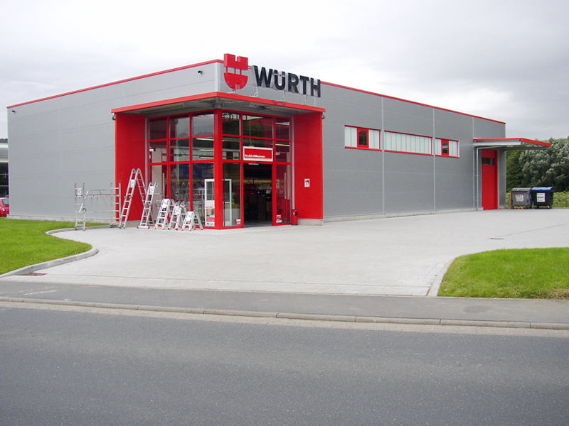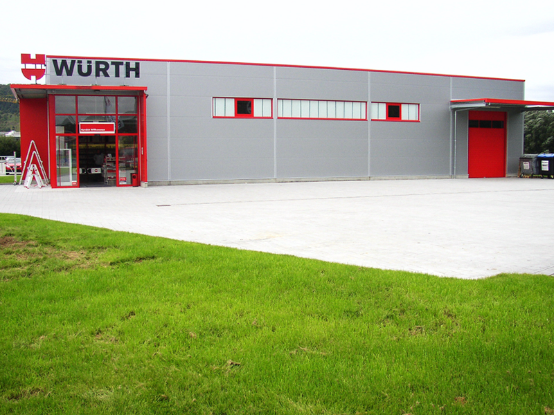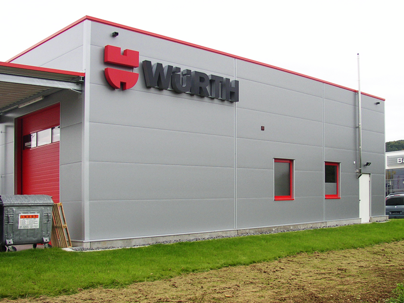 Für die Firma Adolf Würth erstellten wir eine moderne Verkaufhalle mit 440m² Lager- und Verkaufsfläche Verkaufshalle mit 650m² Grundfläche. Die Dacheindeckung besteht aus Stahltrapezpaneelen mit Warmdachaufbau. Im Firstbereich befindet sich 1 Stück Firstlichtband mit RWA-Anlage das gleichzeitig der Ausleuchtung dient.